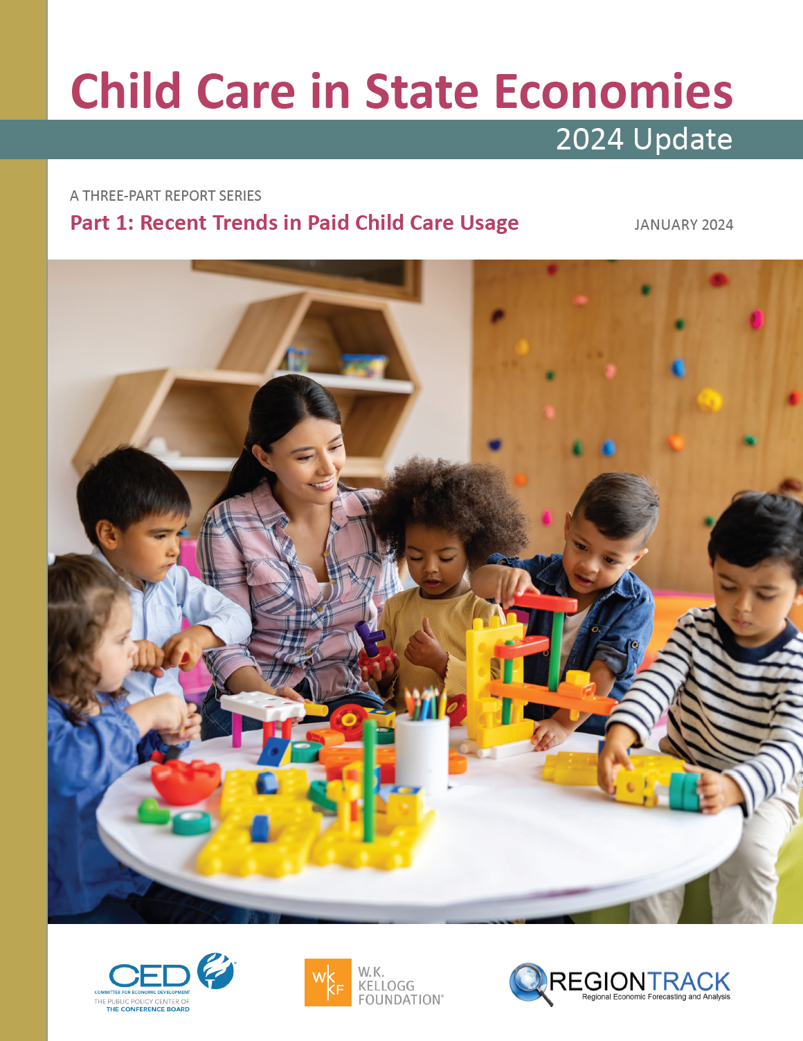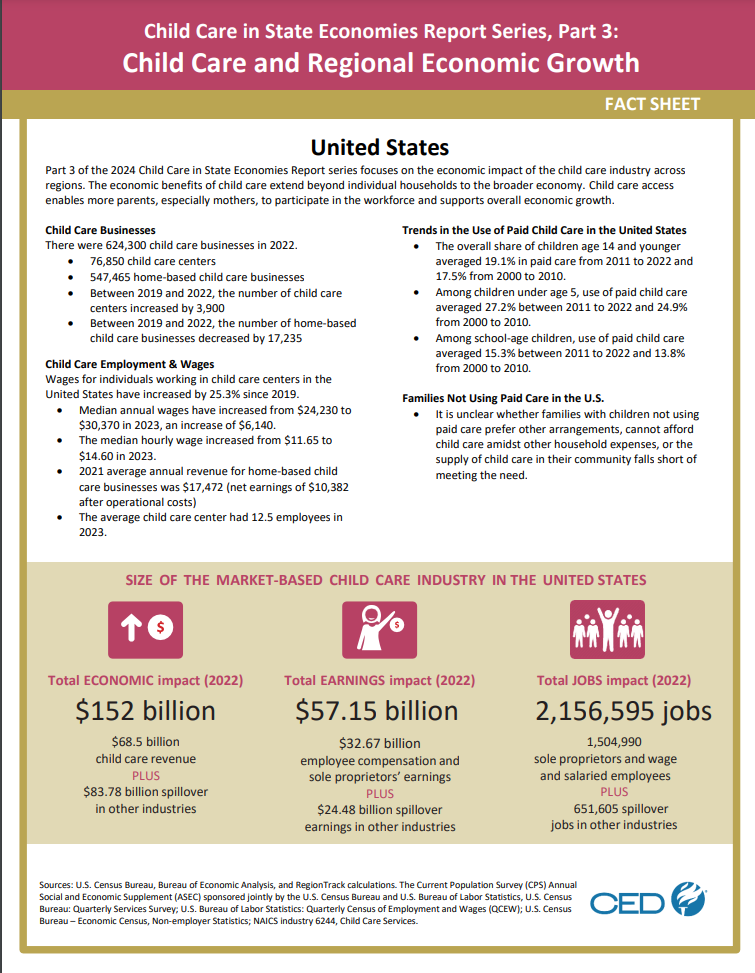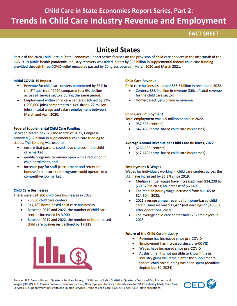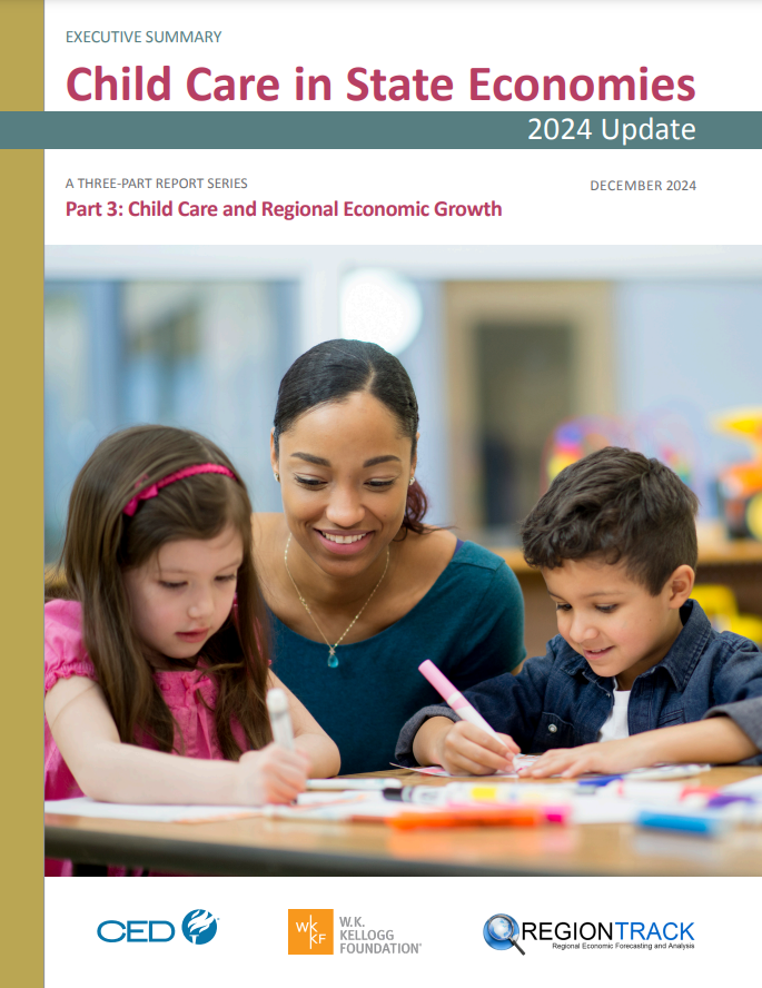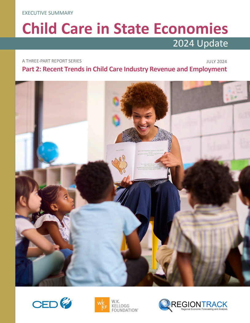 Child Care in State Economies (2024) is a three-part report series examining the current status of the paid child care industry in the U.S. The series provides an update to CED's signature 2019 and 2015 report editions to reflect the most currently available data. The three reports provide a detailed analysis on the paid child care industry following unprecedented disruption during the recent COVID-19 public health pandemic.