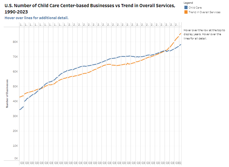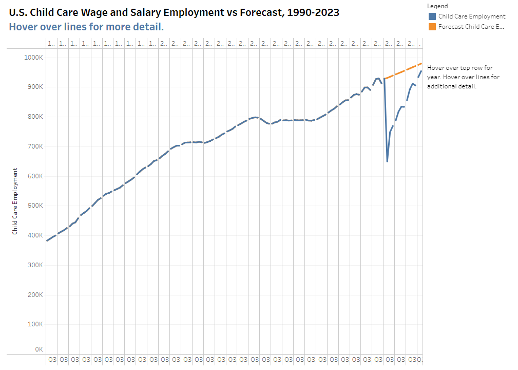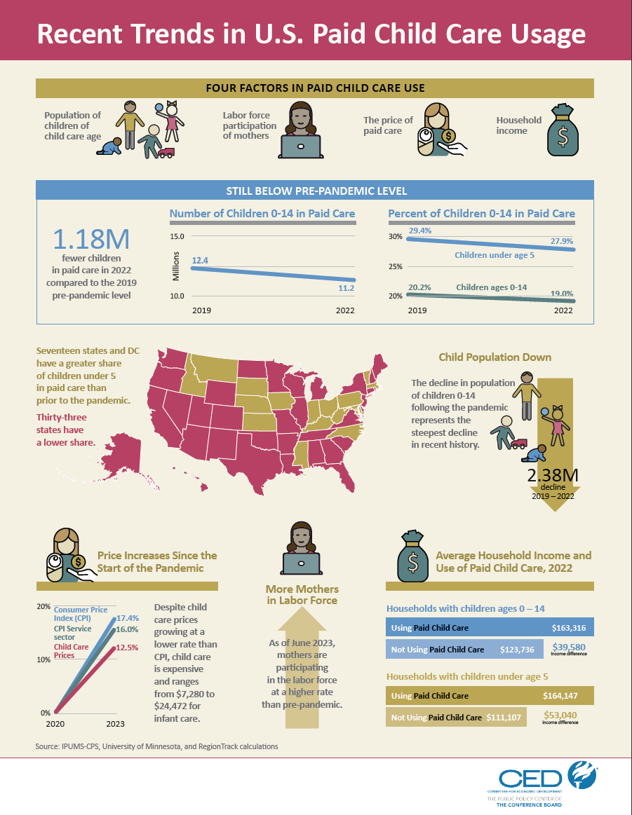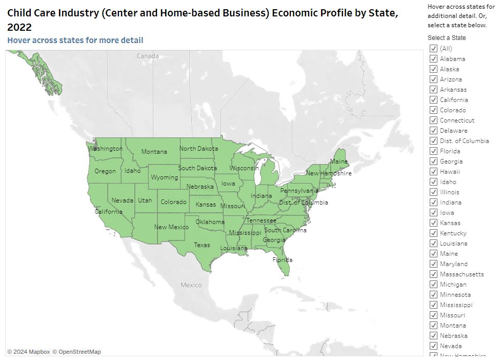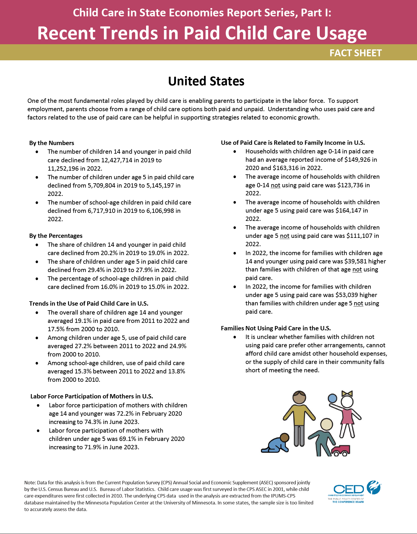 Child Care in State Economies (2024) is a three-part report series examining the current status of the paid child care industry in the U.S. The series provides an update to CED's signature 2019 and 2015 report editions to reflect the most currently available data. The three reports provide a detailed analysis on the paid child care industry following unprecedented disruption during the recent COVID-19 public health pandemic.
