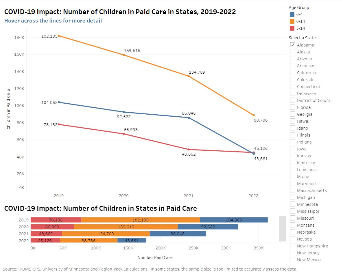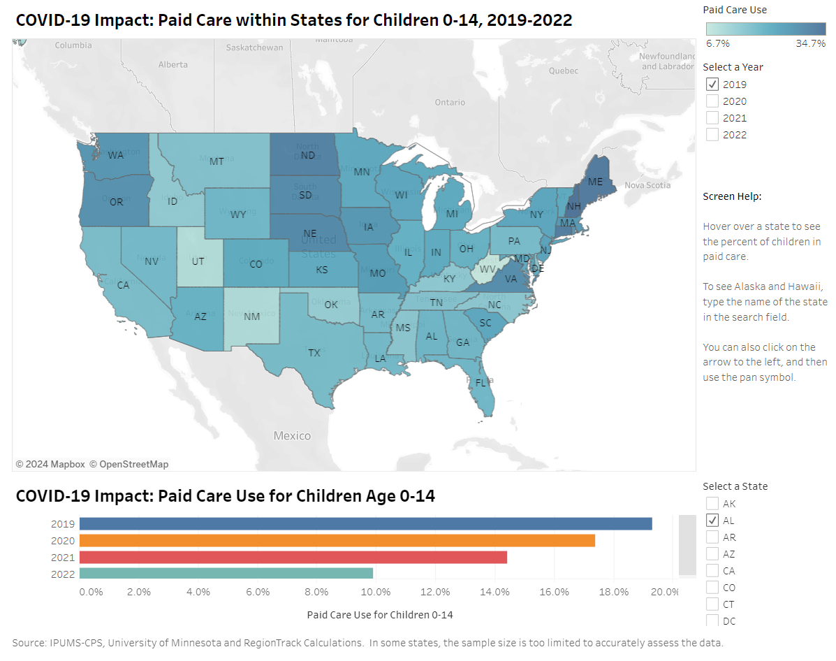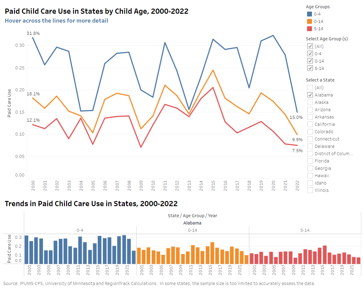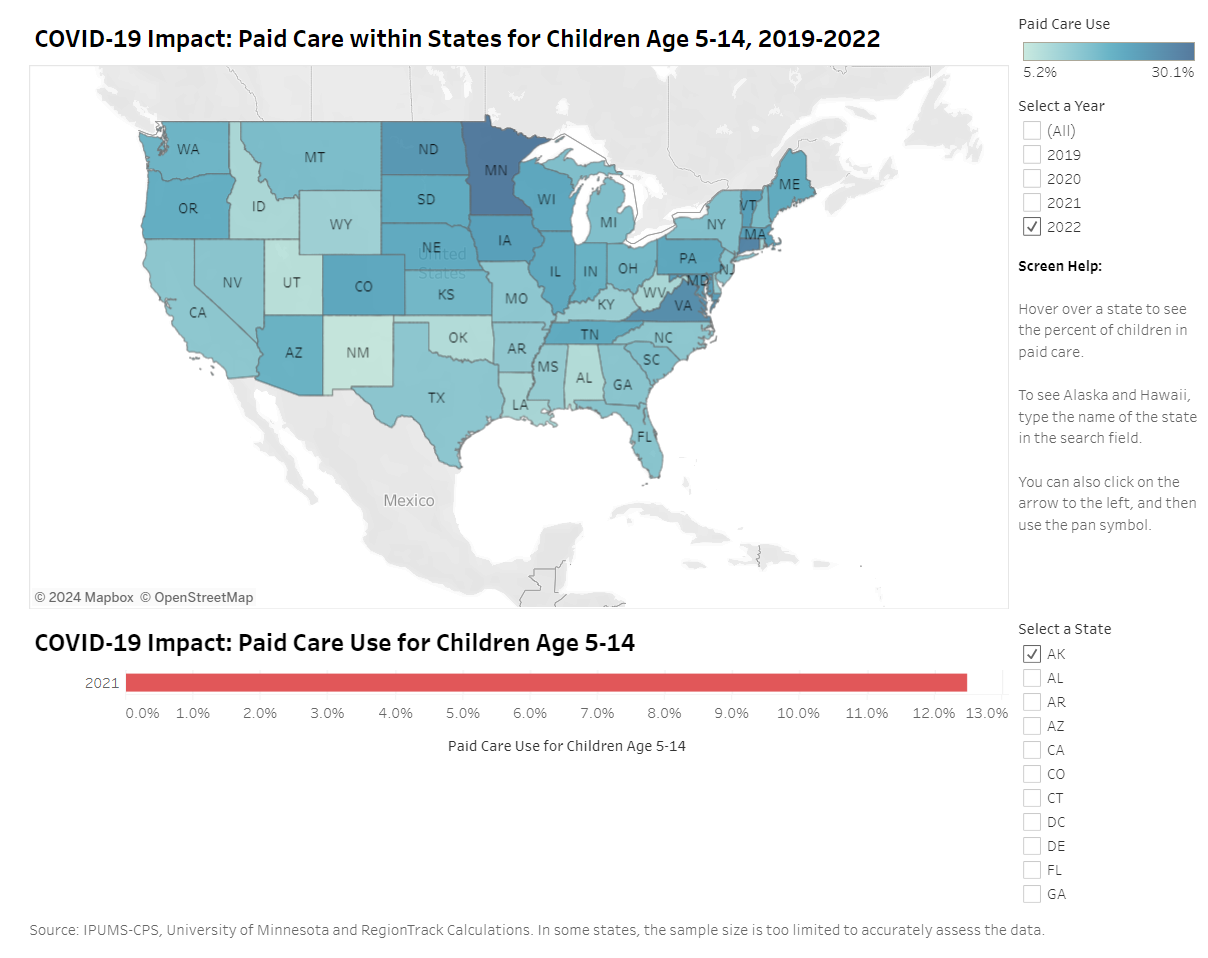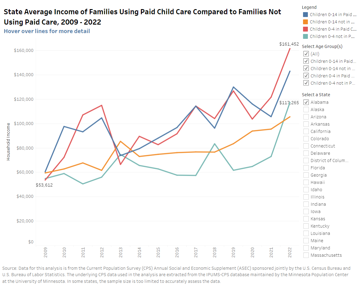 Each dashboard is based on data contained in the Economic Role of Paid Child Care in the U.S. report and is designed to be interactive. Depending upon the individual dashboard, the data can be sorted by year, state (or U.S. average), age of children (e.g., age 14 and younger or under age 5), use of paid care, labor force participation of mothers, share of family income spent on child care, and household income of families using paid care compared to families with children of the same age not using paid care.