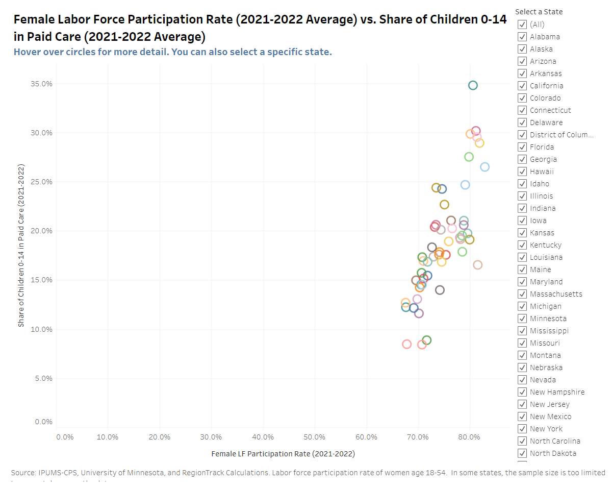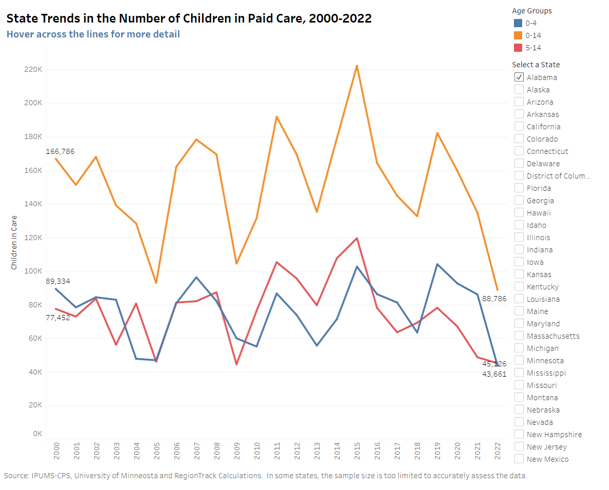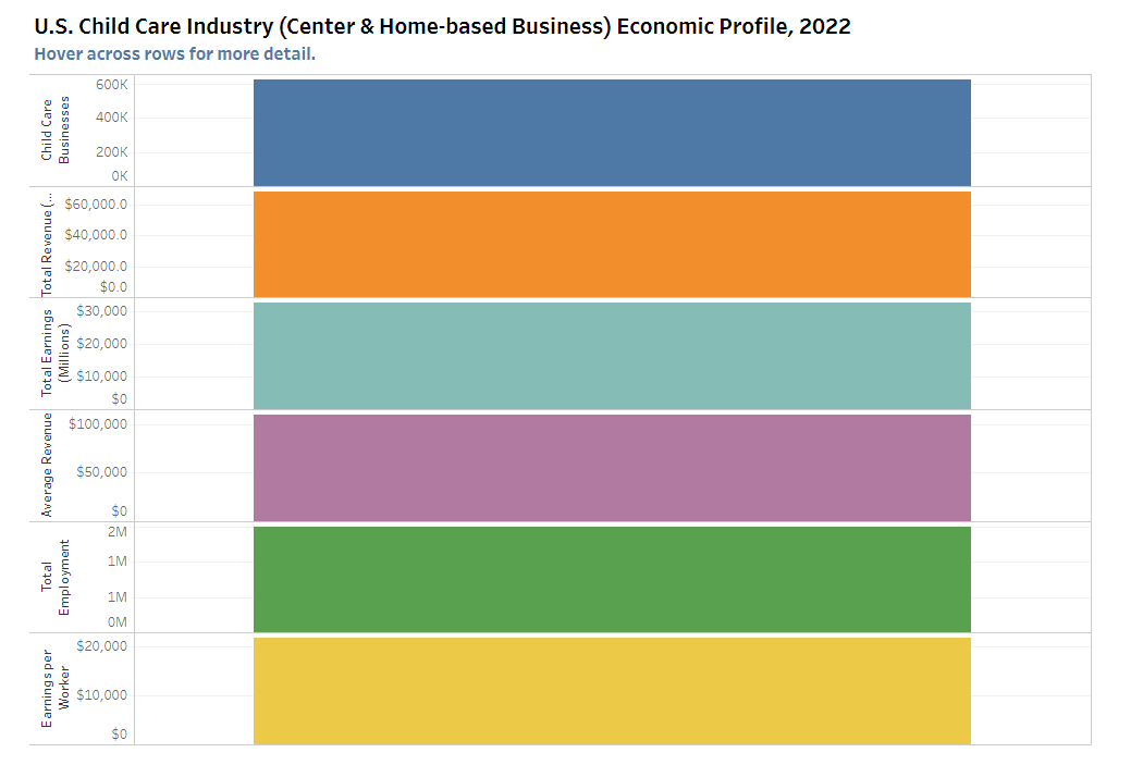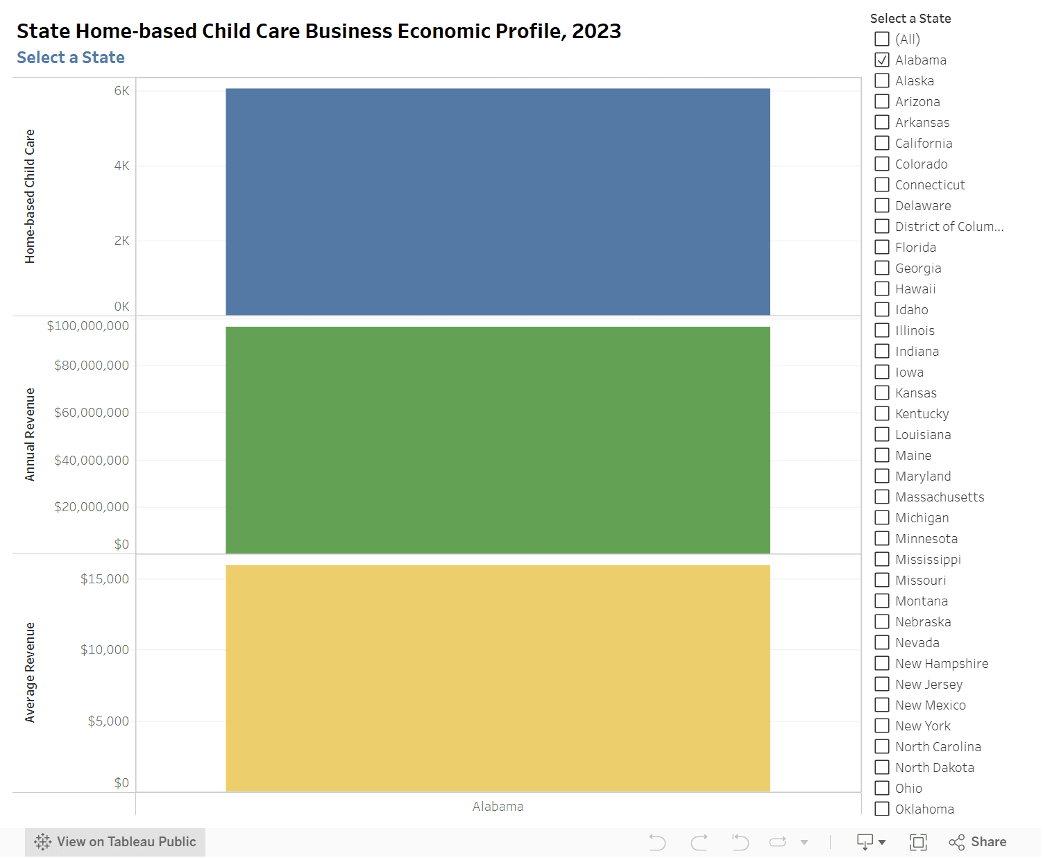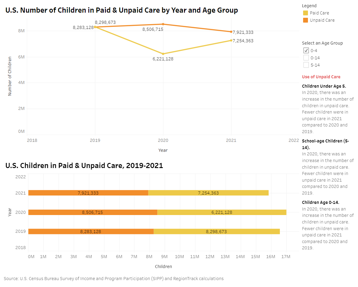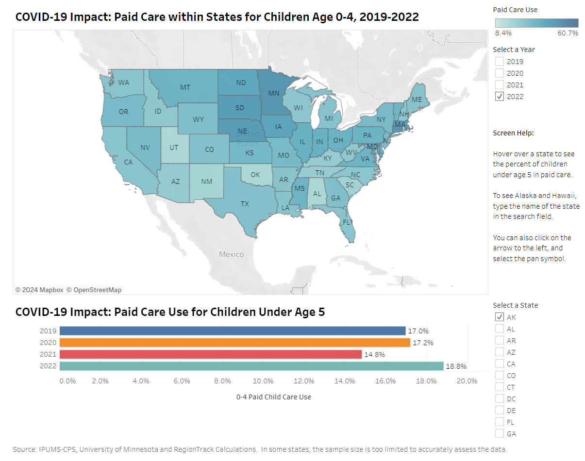 Each dashboard is based on data contained in the Economic Role of Paid Child Care in the U.S. report and is designed to be interactive. Depending upon the individual dashboard, the data can be sorted by year, state (or U.S. average), age of children (e.g., age 14 and younger or under age 5), use of paid care, labor force participation of mothers, share of family income spent on child care, and household income of families using paid care compared to families with children of the same age not using paid care.
