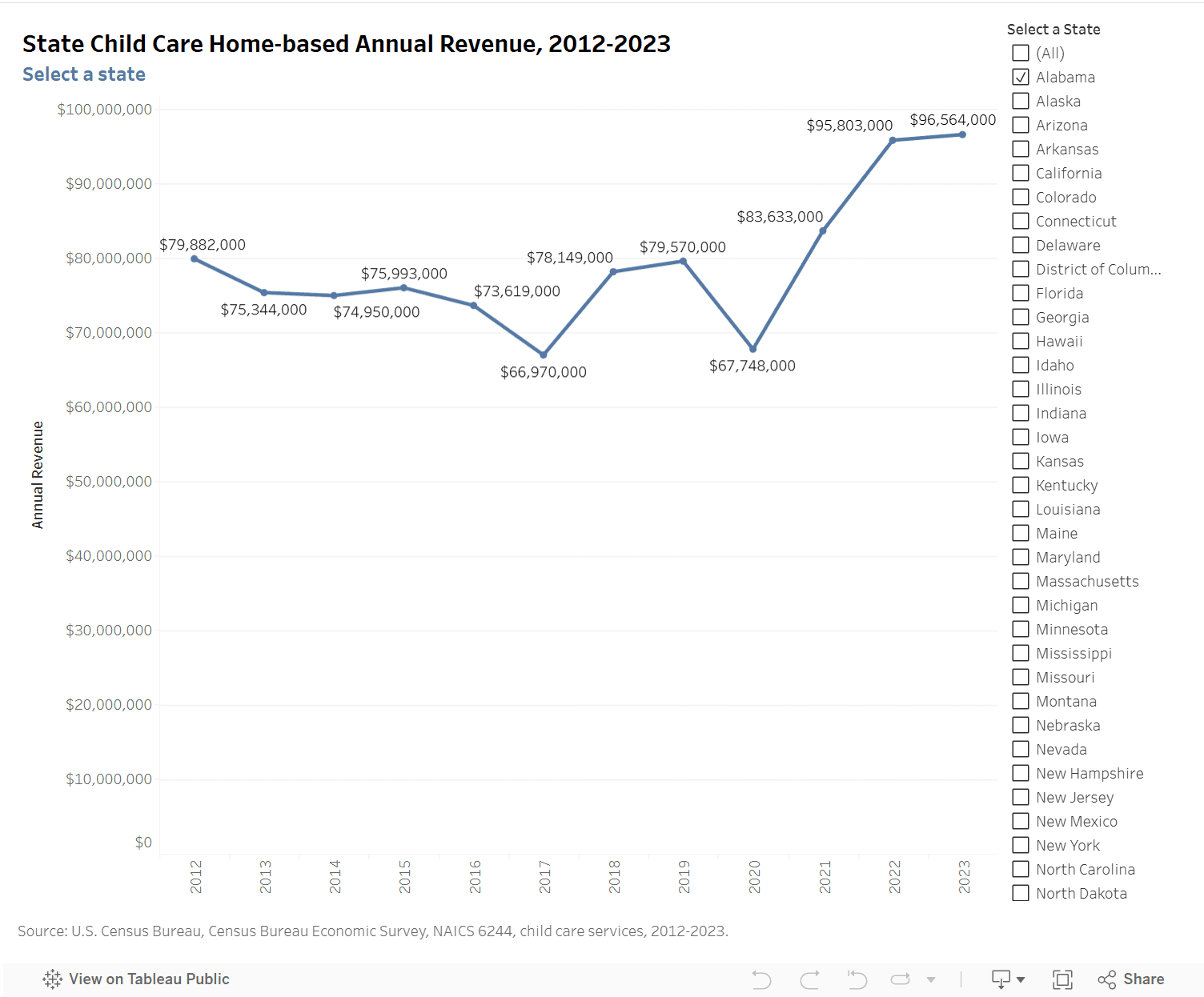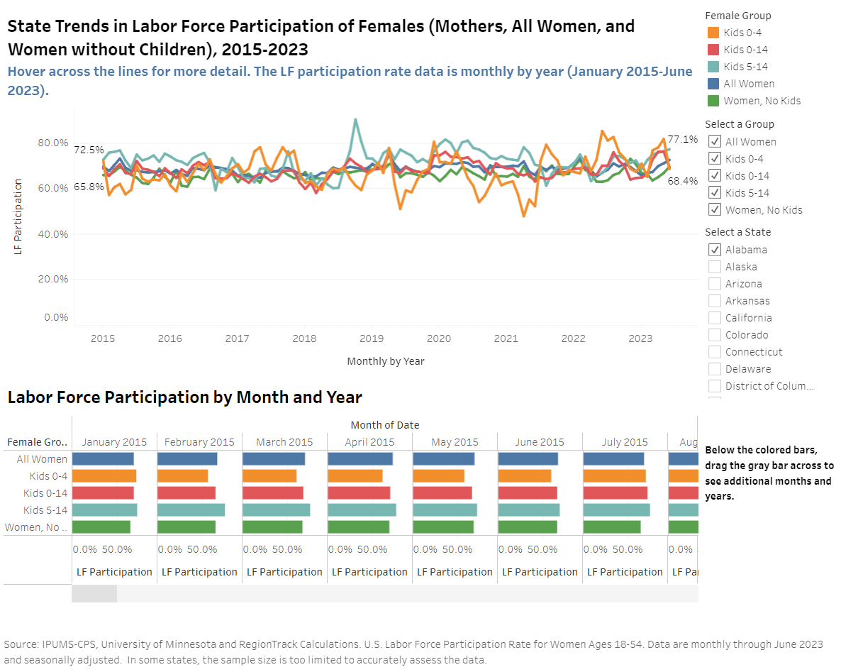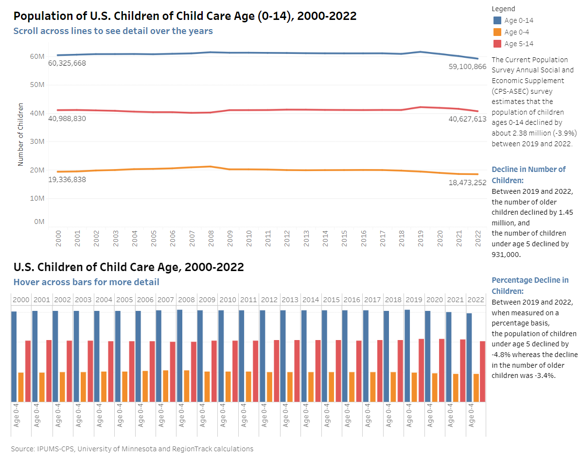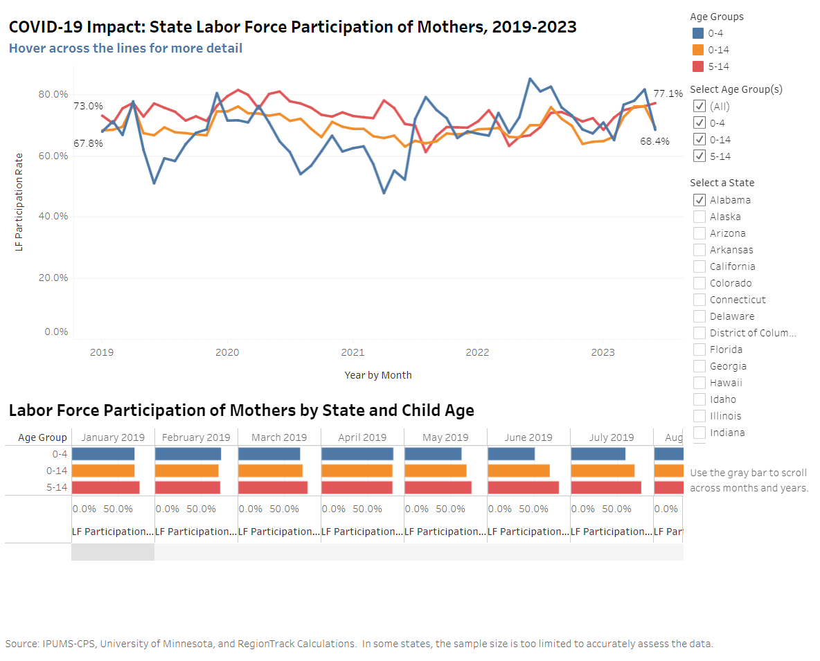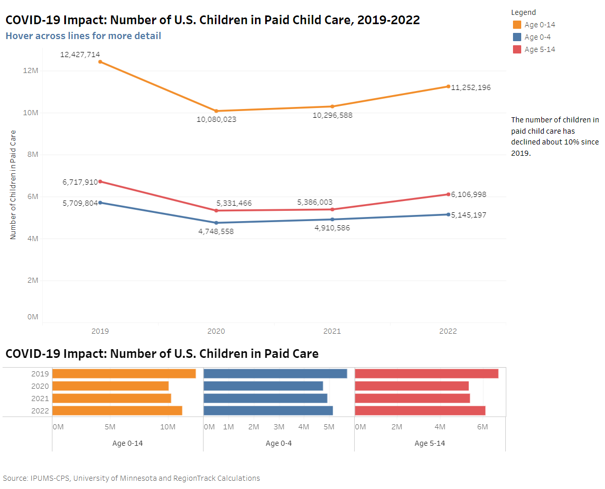 Each dashboard is based on data contained in the Economic Role of Paid Child Care in the U.S. report and is designed to be interactive. Depending upon the individual dashboard, the data can be sorted by year, state (or U.S. average), age of children (e.g., age 14 and younger or under age 5), use of paid care, labor force participation of mothers, share of family income spent on child care, and household income of families using paid care compared to families with children of the same age not using paid care.
