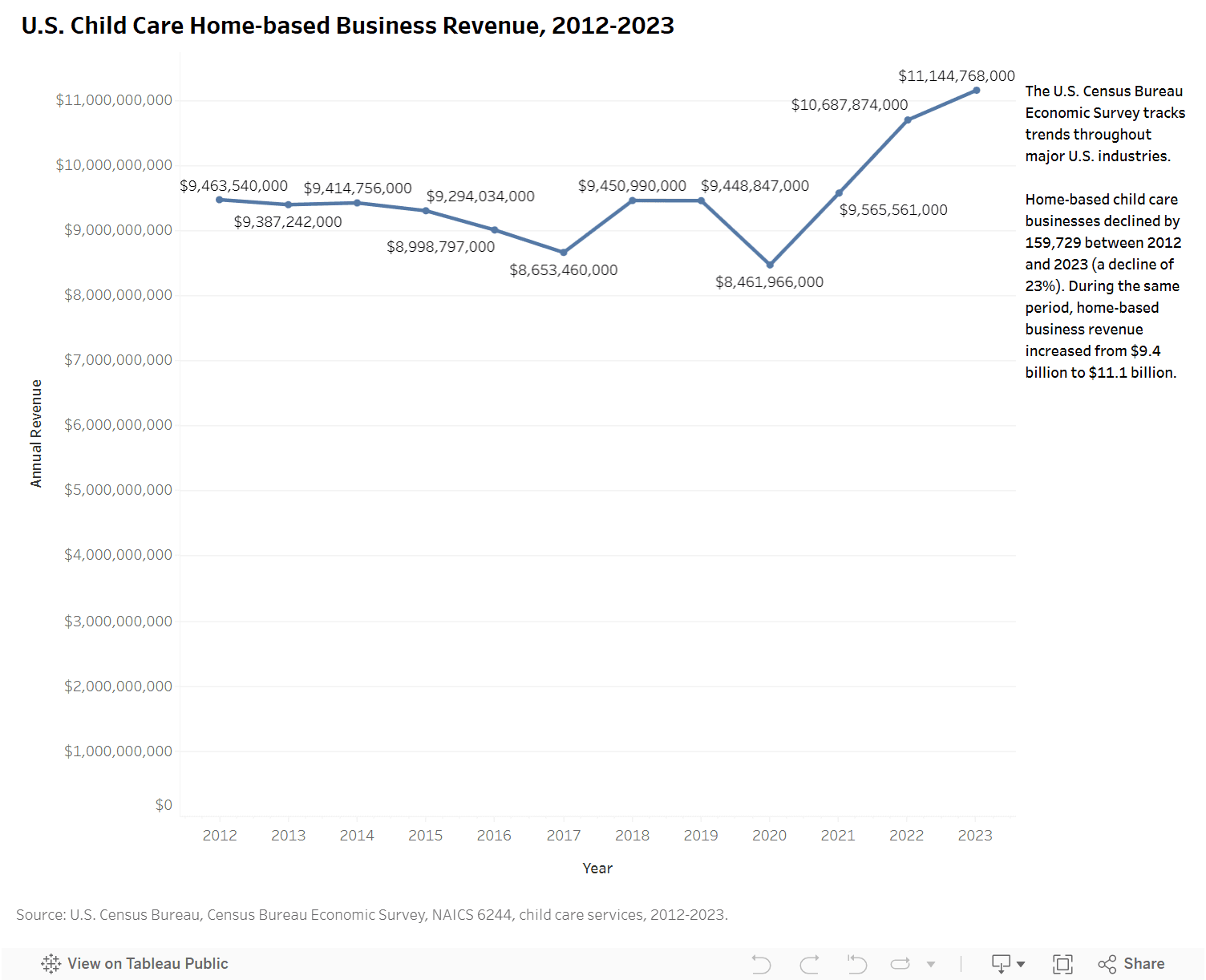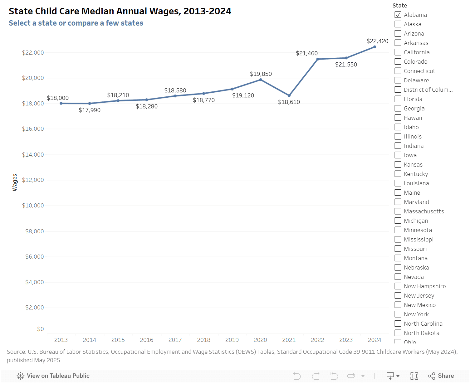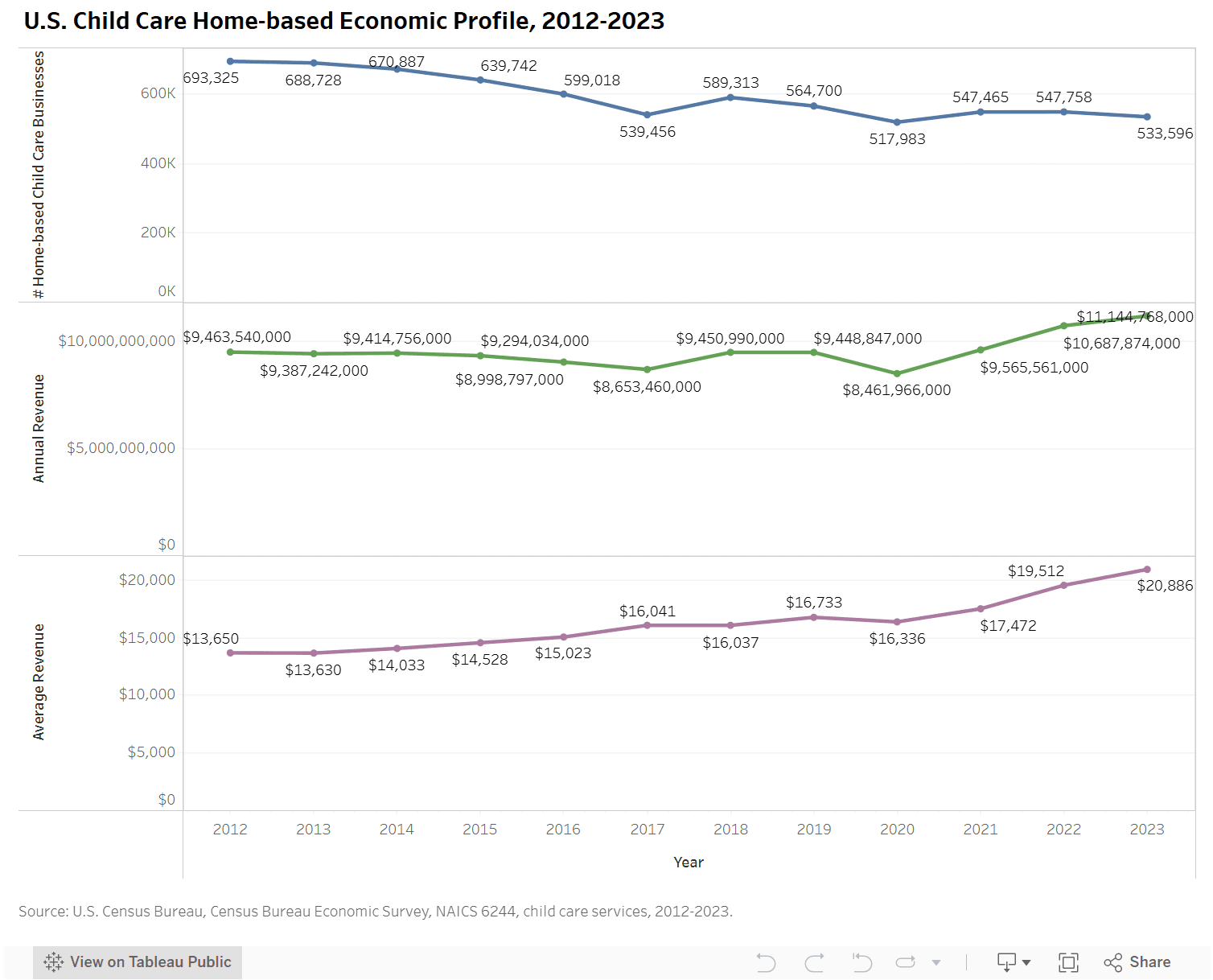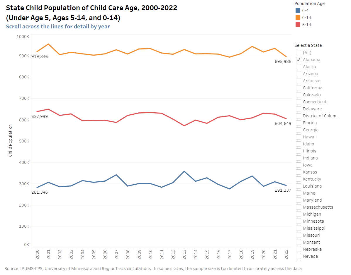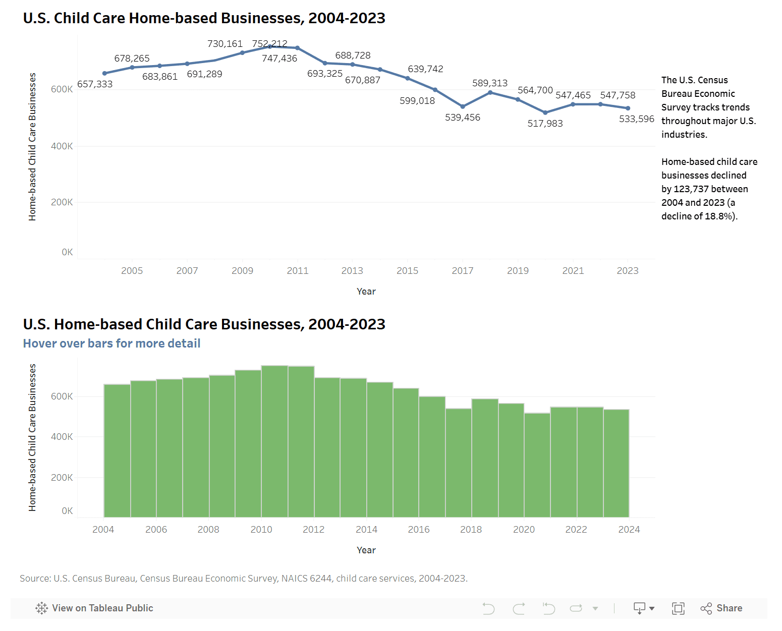 Each dashboard is based on data contained in the Economic Role of Paid Child Care in the U.S. report and is designed to be interactive. Depending upon the individual dashboard, the data can be sorted by year, state (or U.S. average), age of children (e.g., age 14 and younger or under age 5), use of paid care, labor force participation of mothers, share of family income spent on child care, and household income of families using paid care compared to families with children of the same age not using paid care.