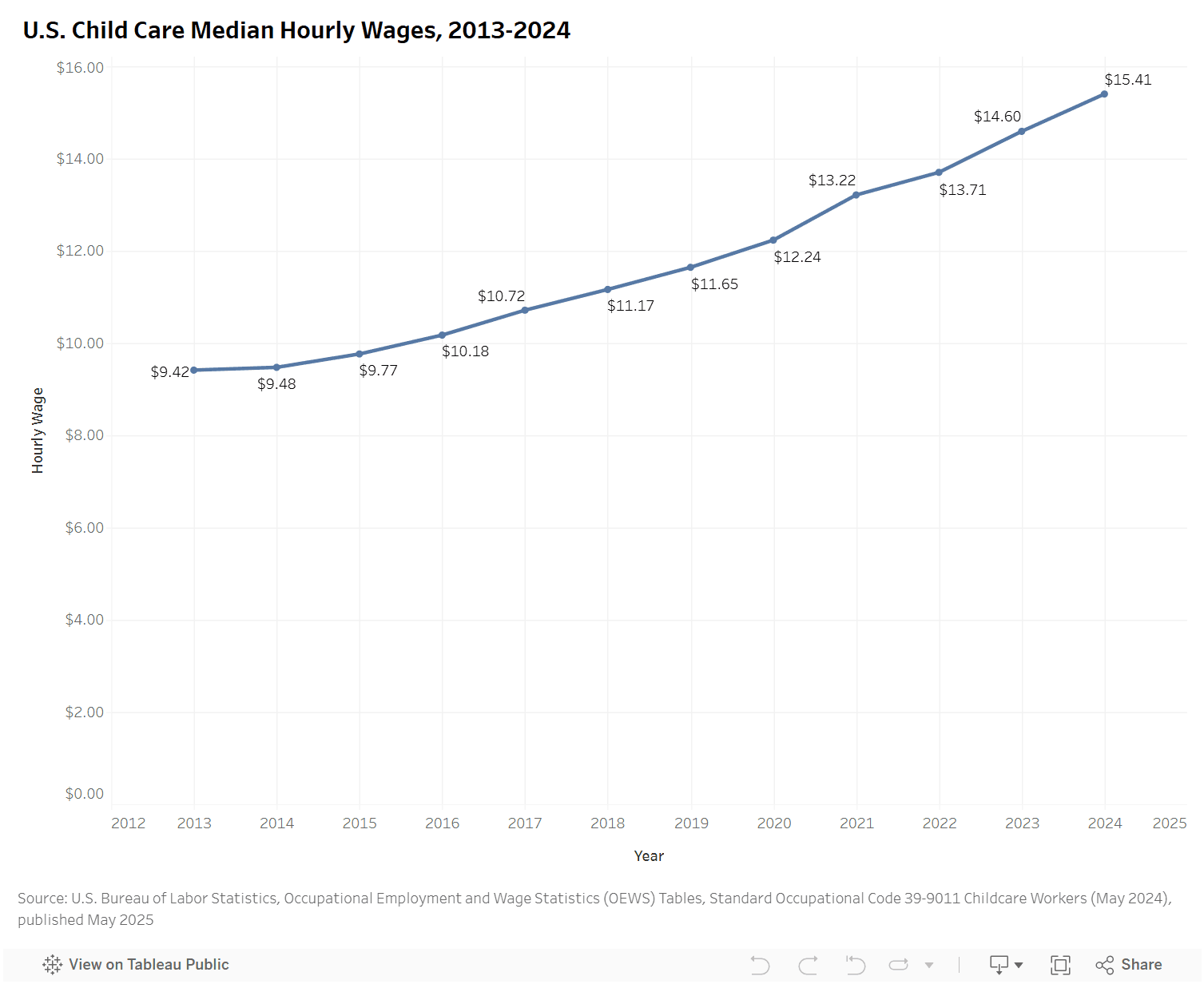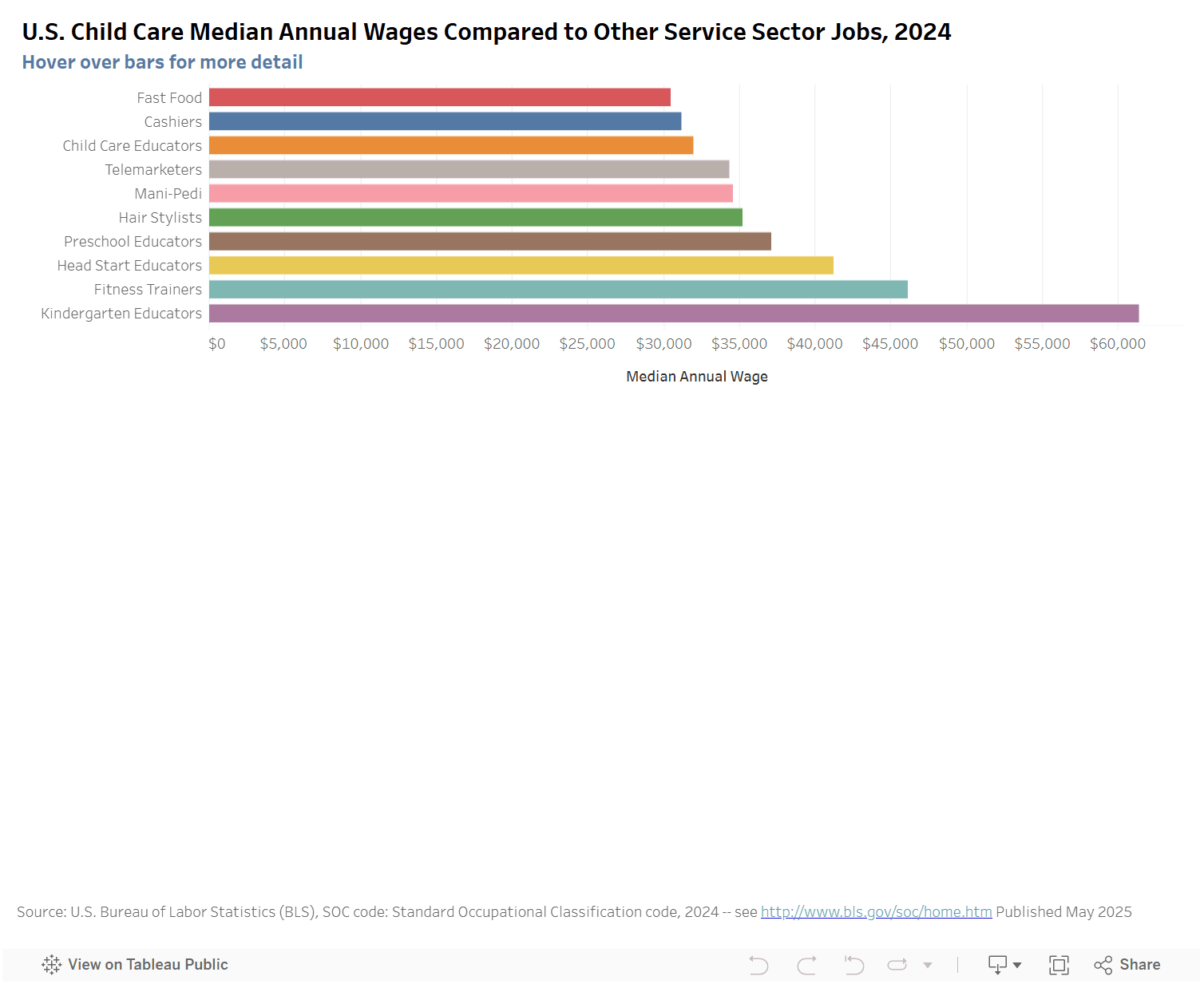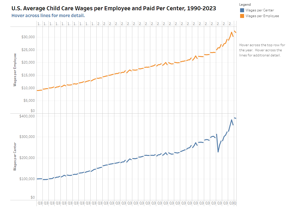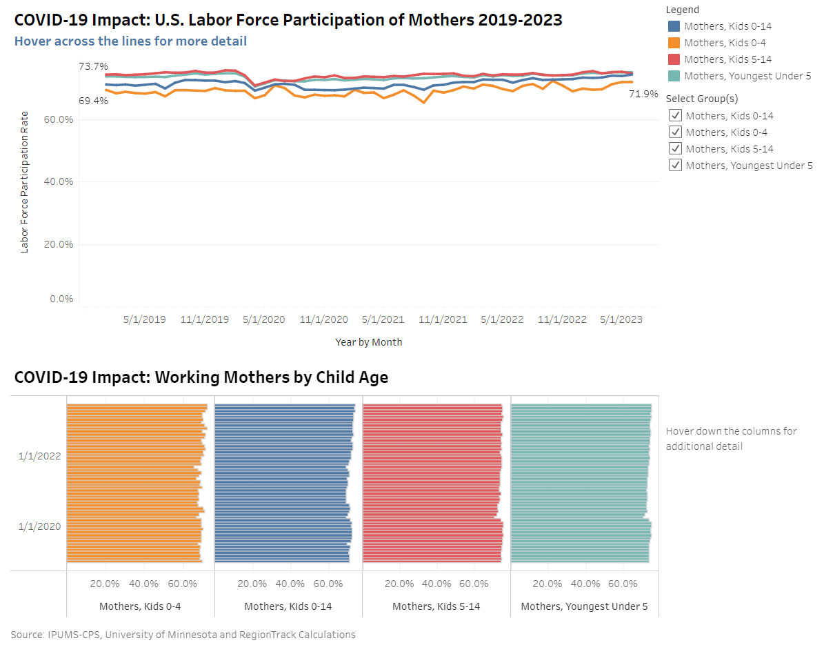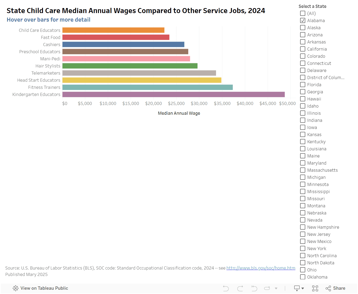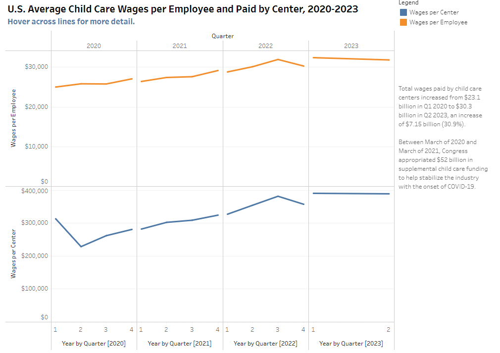 Each dashboard is based on data contained in the Economic Role of Paid Child Care in the U.S. report and is designed to be interactive. Depending upon the individual dashboard, the data can be sorted by year, state (or U.S. average), age of children (e.g., age 14 and younger or under age 5), use of paid care, labor force participation of mothers, share of family income spent on child care, and household income of families using paid care compared to families with children of the same age not using paid care.