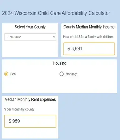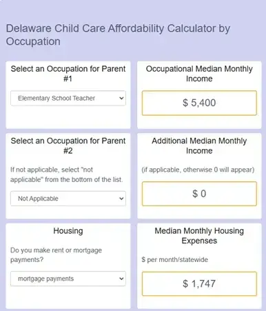 | Wisconsin: A calculator was developed for the Wisconsin Early Childhood Association (WECA). The calculator enables users to select their county (to determine county median income) and then to select the type of housing payments -- rent or mortgage, which then displays average housing costs for the county selected. | Delaware: Two calculators were developed for Rodel in Delaware. One calculator shows family expenses based on county income. The other calculator shows family expenses based on either one or two occupations for parents in the household. (Users choose the occupation). |
