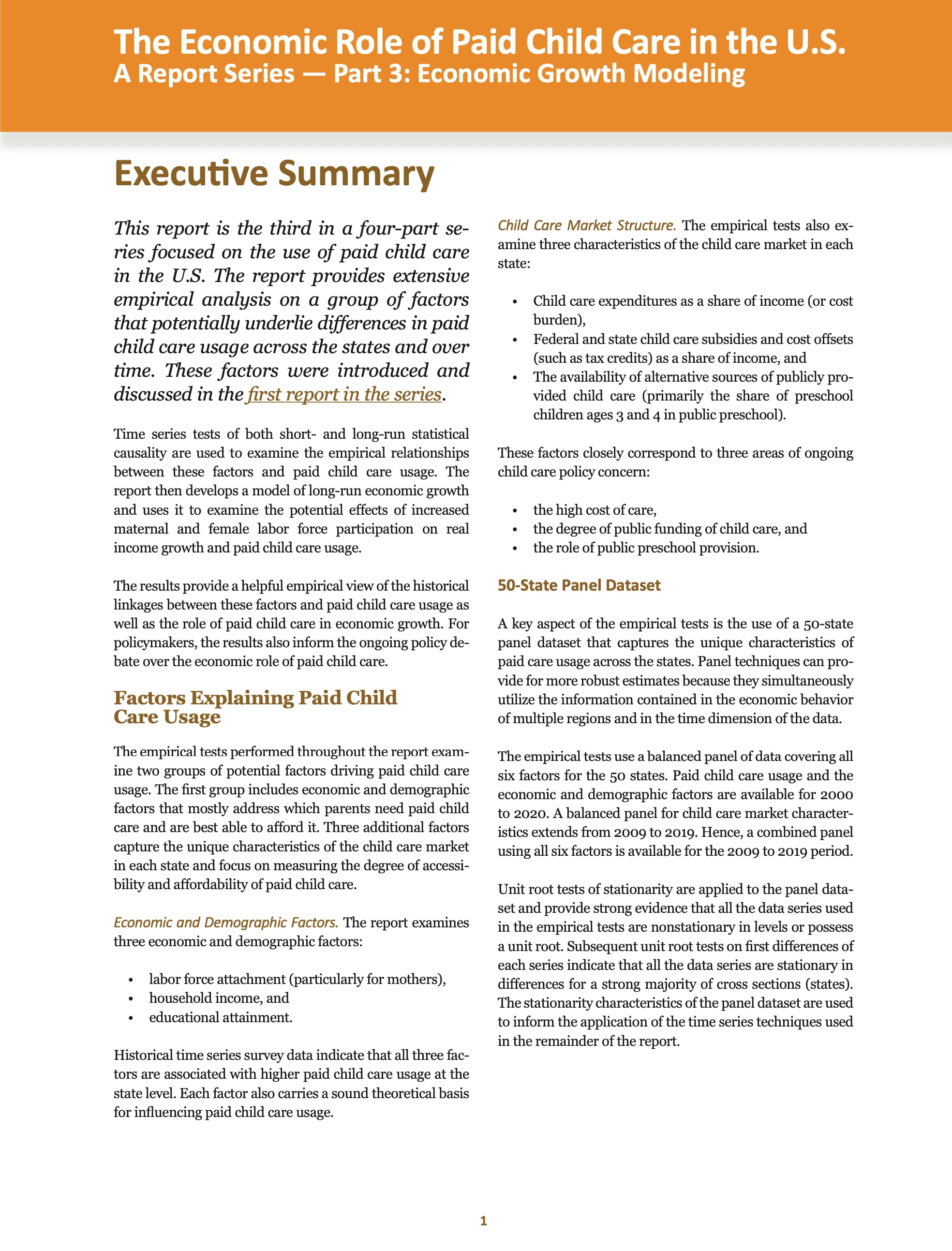 - Part 3 – Economic Growth Modeling: explores economic growth associated with increasing levels of maternal labor force participation and access to paid child care.