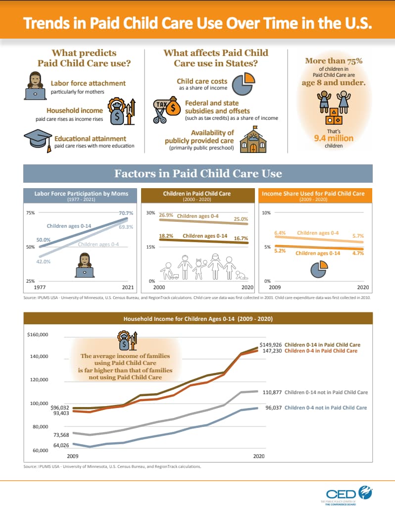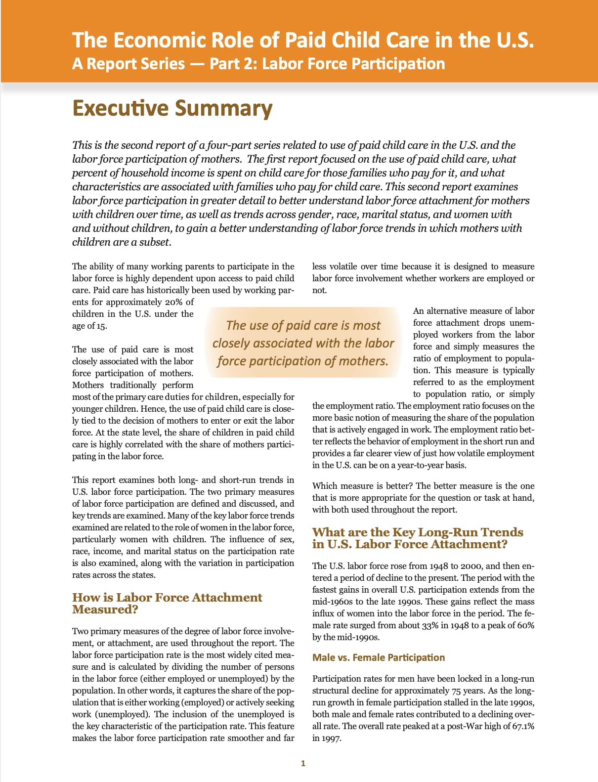 The Economic Role of Paid Child Care in the U.S. Report Series examines the use of paid child care and labor force participation of mothers through a four-part series.
