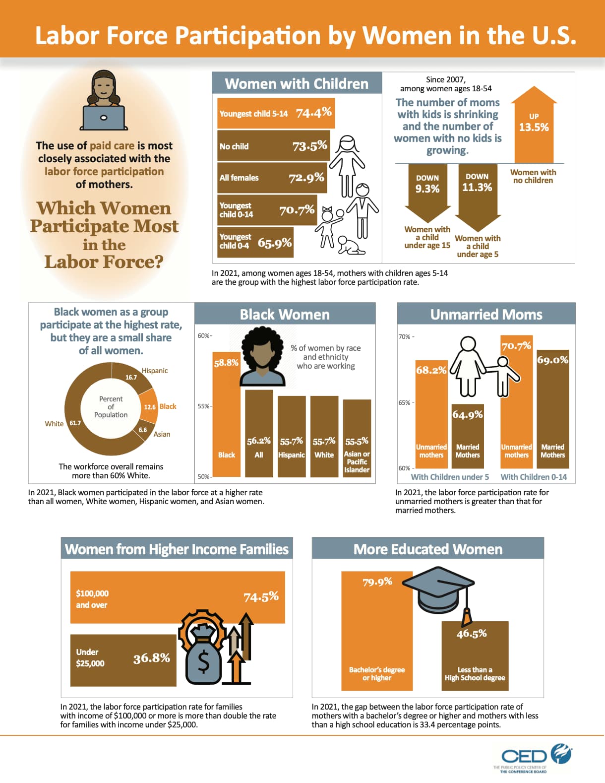- Part 2 – Labor Force Participation: reviews the labor force participation of mothers in greater detail (across income, race, and major occupations).